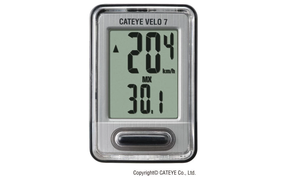 Der neu designte Velo 7 ist CatEyes Einsteigercomputer. Das neue große Display ist bestens abzulesen, und die Einstellung ist durch vorgegebene Reifengrößen deutlich vereinfacht. Zu den Grundfunktionen aktuelle und maximale Geschwindigkeit, Tagesdistanz und Gesamtkilometer gesellen sich die Durchschnittsgeschwindigkeit und die Fahrzeit.