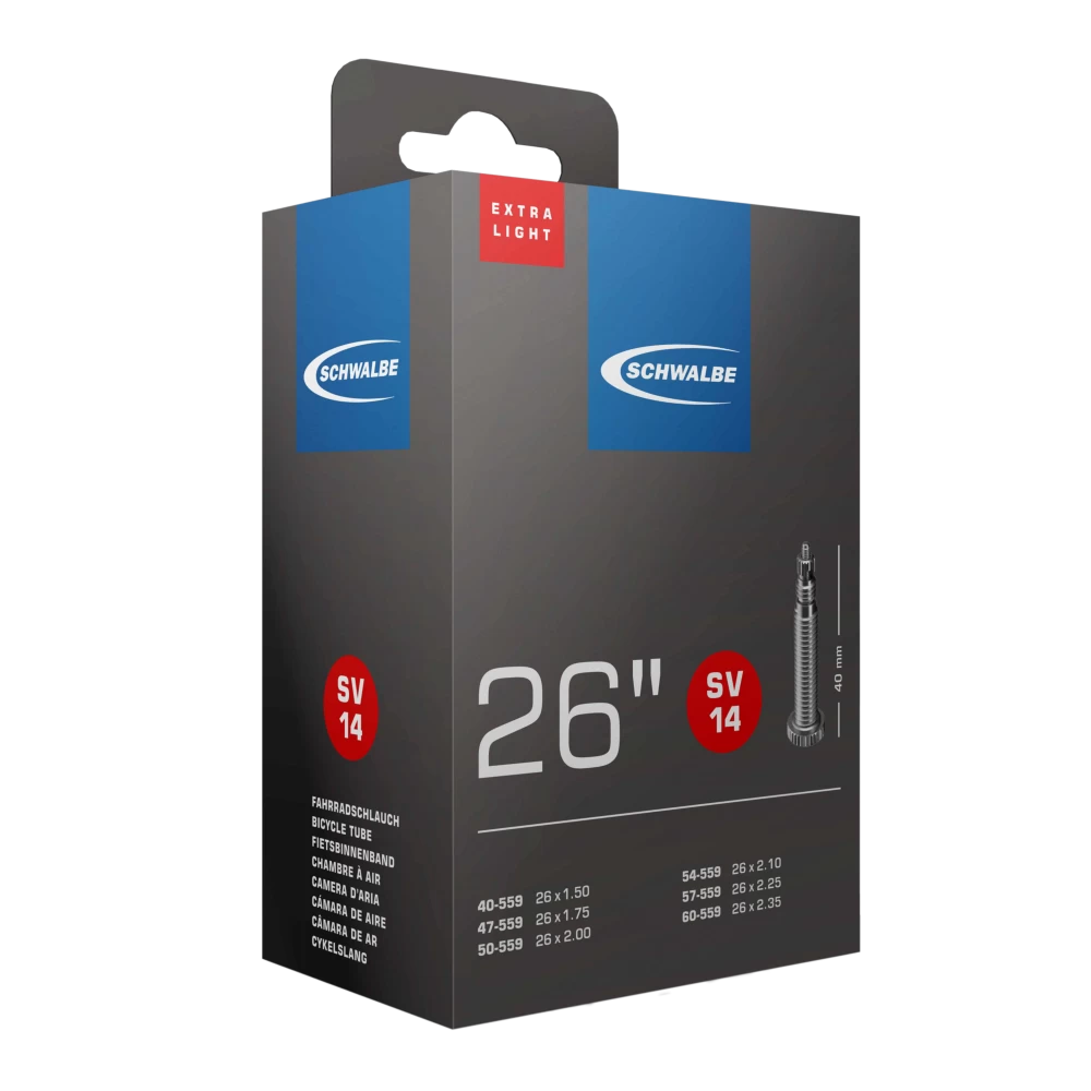 Schwalbe EXTRA LIGHT Fahrradschlauch Nr. 14. Für Fahrradreifen in der Größe 26″ Zoll (ETRTO 40/60-559).