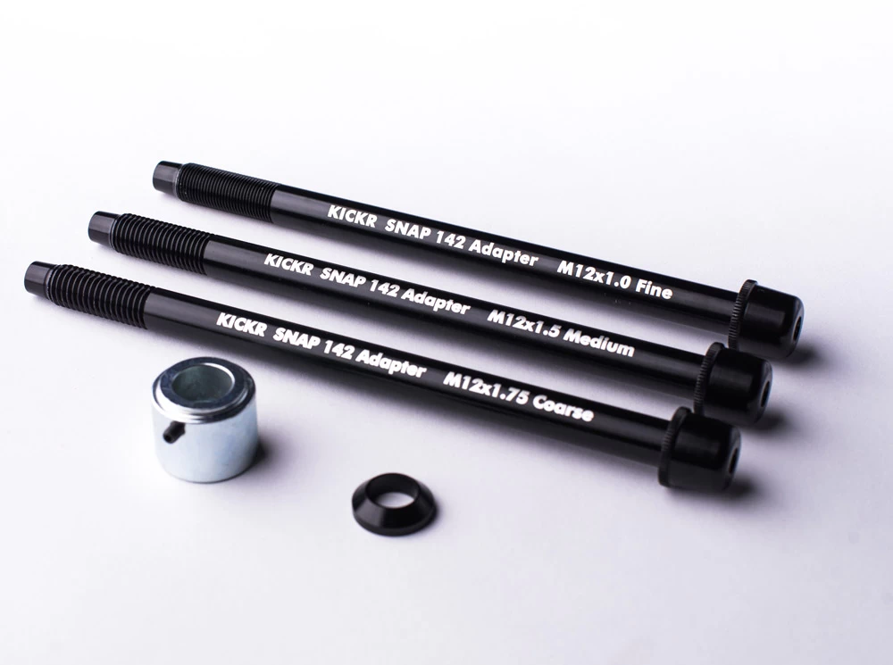 Dieses Steckachsenset enthält alles, was Du brauchst, um die meisten Fahrräder mit einer 12×142 Steckachse auf dem KICKR SNAP Indoor-Trainer zu befestigen. Dieses Zubehör funktioniert mit allen Editionen des Wahoo KICKR SNAP.